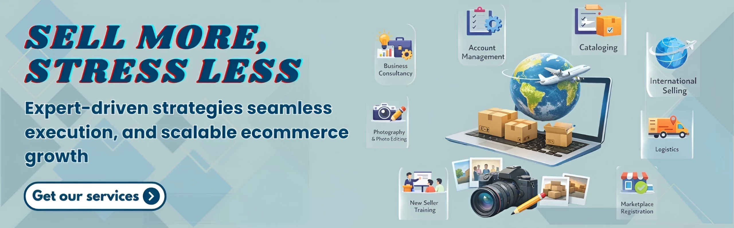 We provide various services to manage all your online business operations like analytic services, logistics, consultancy, warehousing, marketplace product launch services, software services, cataloging & content writing, photography & photo editing and training services.